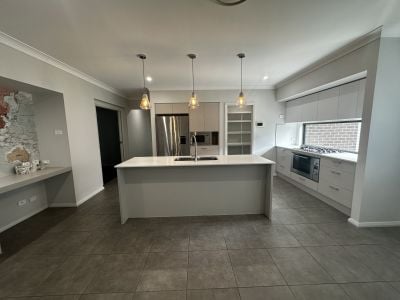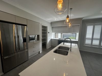 • Sleek modern kitchen with stone bench tops, stainless steel appliances & walk in pantry