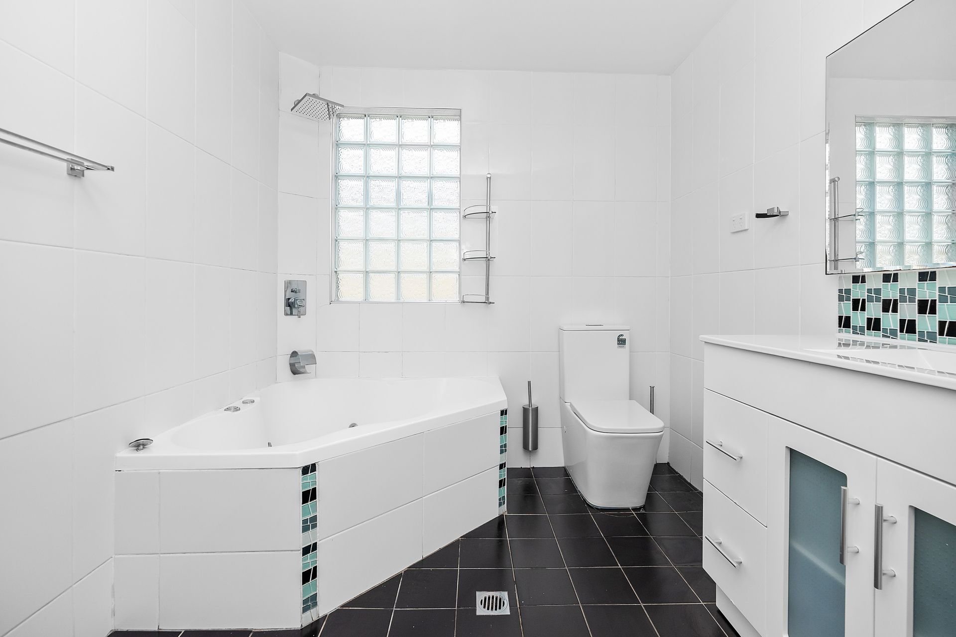 - Main bathroom with relaxing corner bath, large vanity, and heated towel rack for added comfort.