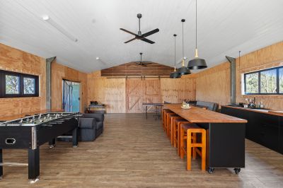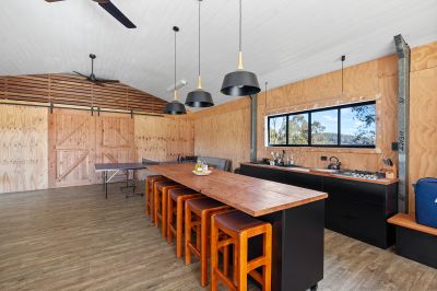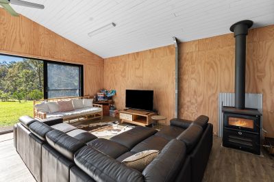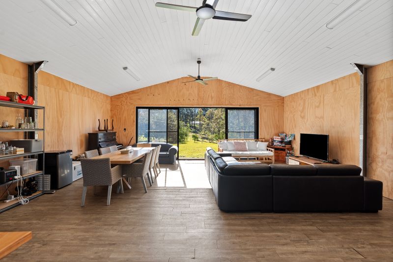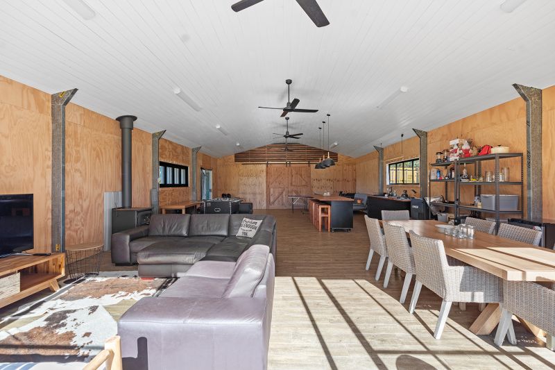 Currently, a walk-in walk-out furnished steel shed serves as a cozy weekender. Divided into two living areas, it features a kitchenette, separate bathroom, bunk room, and a slow combustion fire for those chilly nights. Additionally, the owner will leave a caravan and container for extra accommodation and storage, ensuring ample space for guests or hobbies.