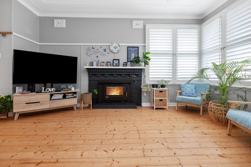 - Open plan living & dining, featuring timber floorboards, a cozy fireplace, air conditioning, and elegant plantation shutters, creating a warm and inviting atmosphere.