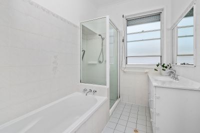 - Practical family bathroom complete with bathtub, shower and vanity.