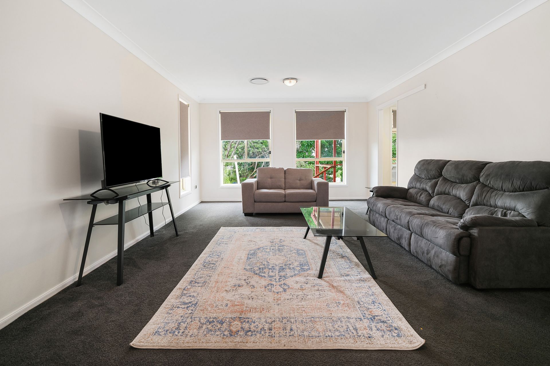 - Large open-plan living area with freshly laid carpet, offering comfort and space for the whole family