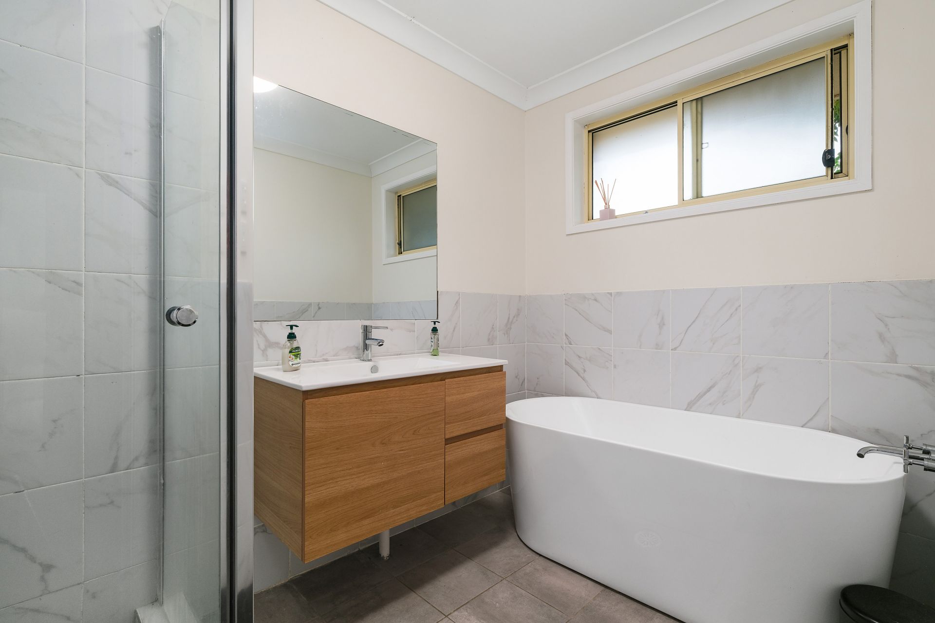 - Partly renovated main bathroom featuring a new bathtub, vanity, fresh tiling and a separate toilet