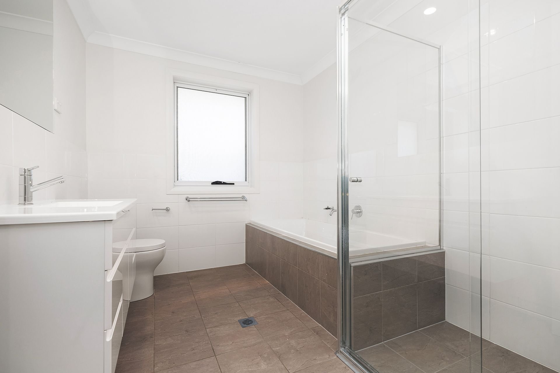 - Modern main bathroom – spacious design with a full-size bathtub, large vanity, shower, and toilet.