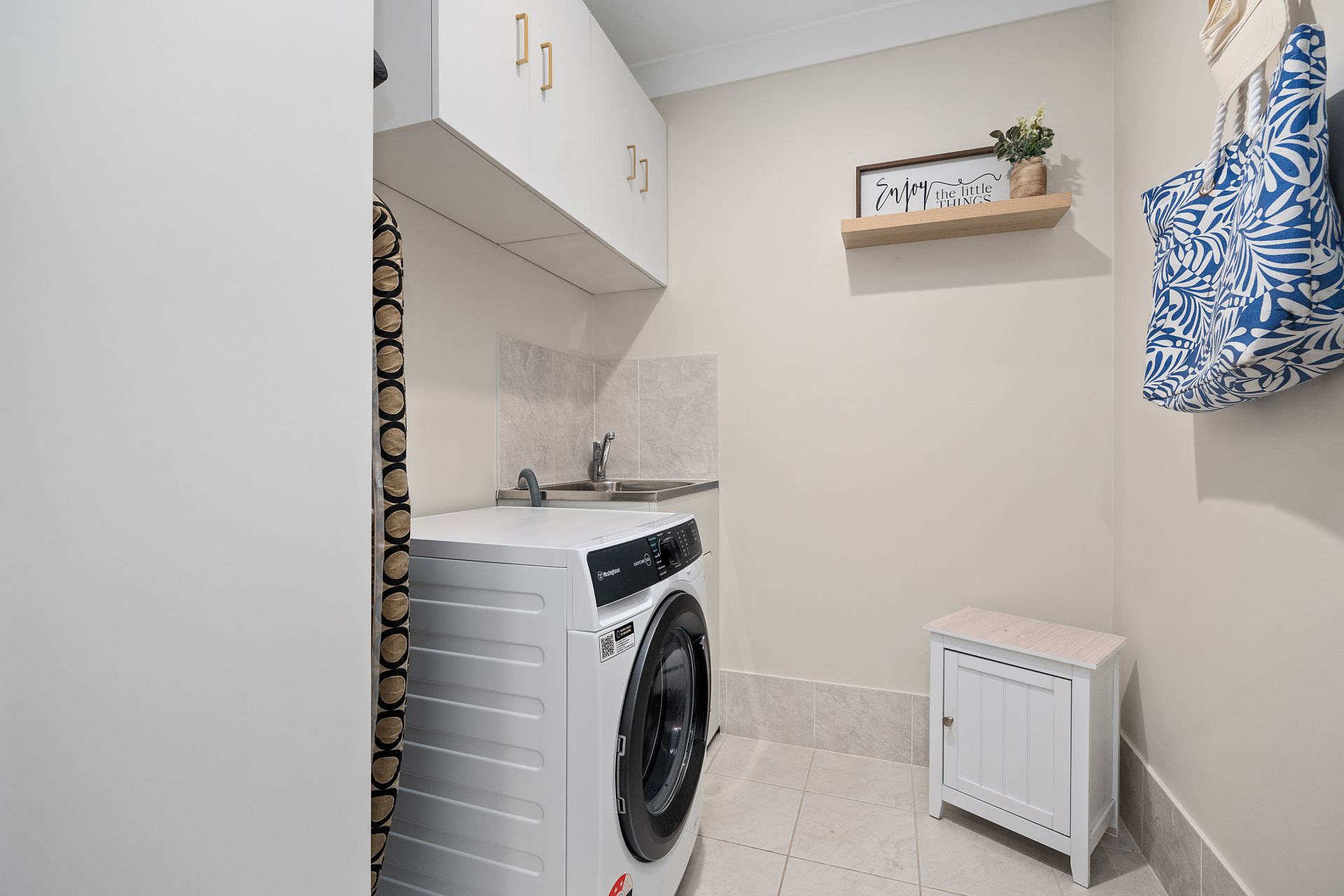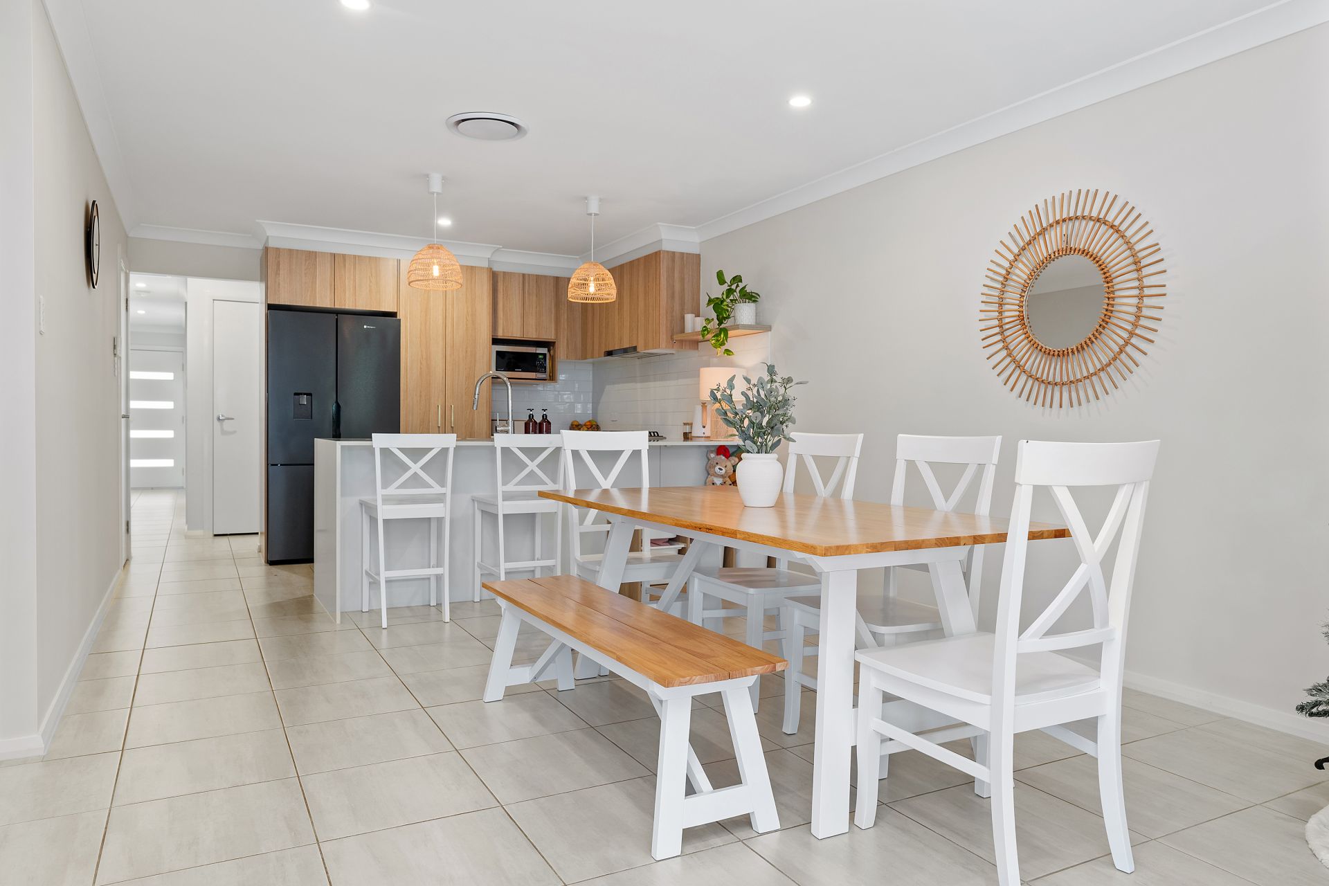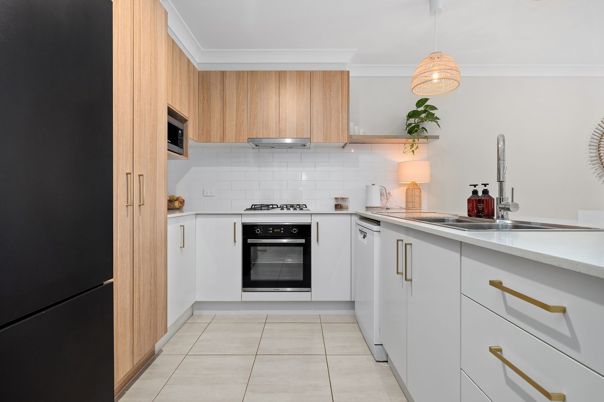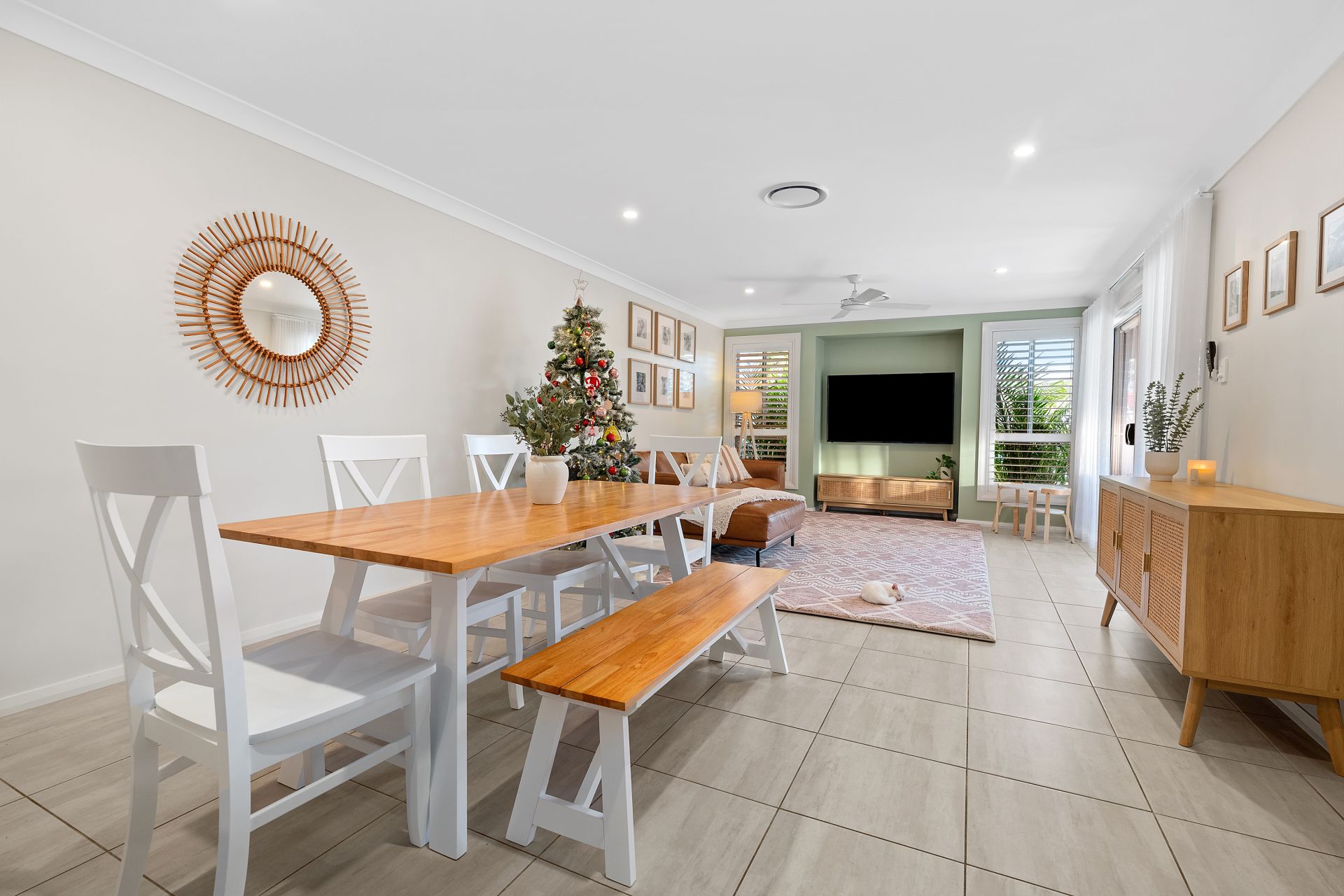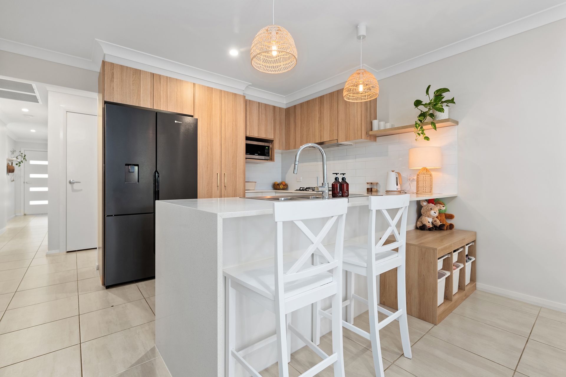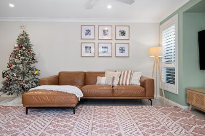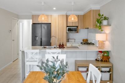 Tiled throughout, the open-plan living and dining area flows seamlessly from the designer kitchen-showcasing premium cabinetry with brushed gold handles, Caesarstone benchtops with waterfall edge, gas cooktop and dishwasher-straight out to the tiled alfresco. With in-track blinds creating an additional enclosed living space, it's perfect for year-round entertaining.