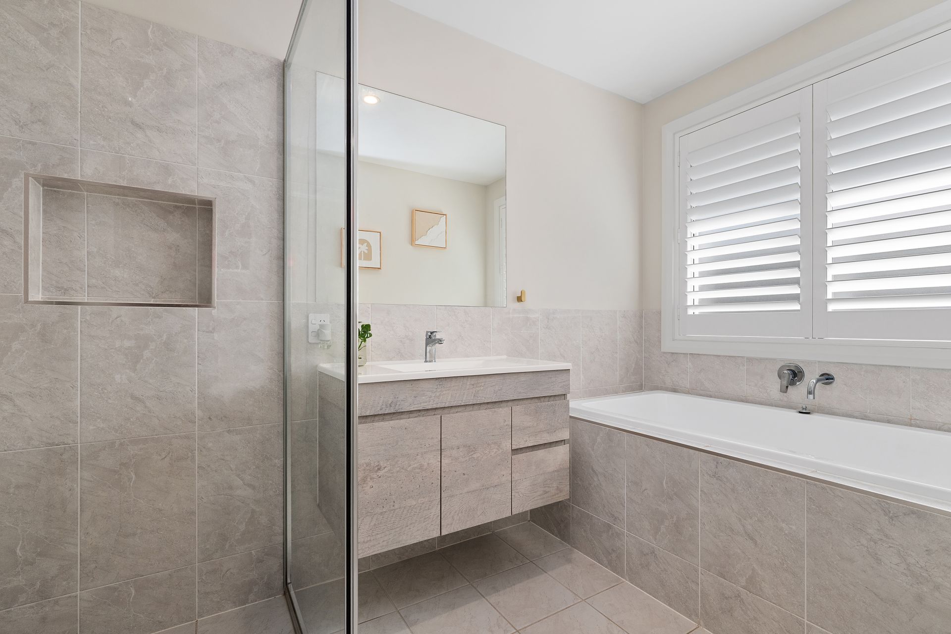 The main bathroom continues the luxury feel with a suspended vanity, relaxing bath and separate shower with niche.