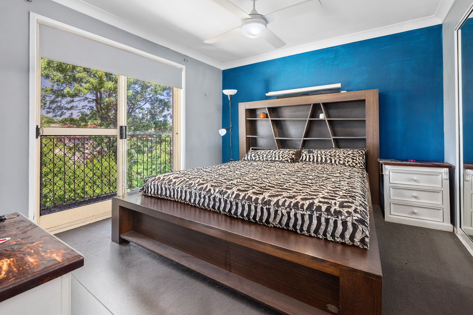 - Master bedroom with ceiling fan, private balcony, and ensuite