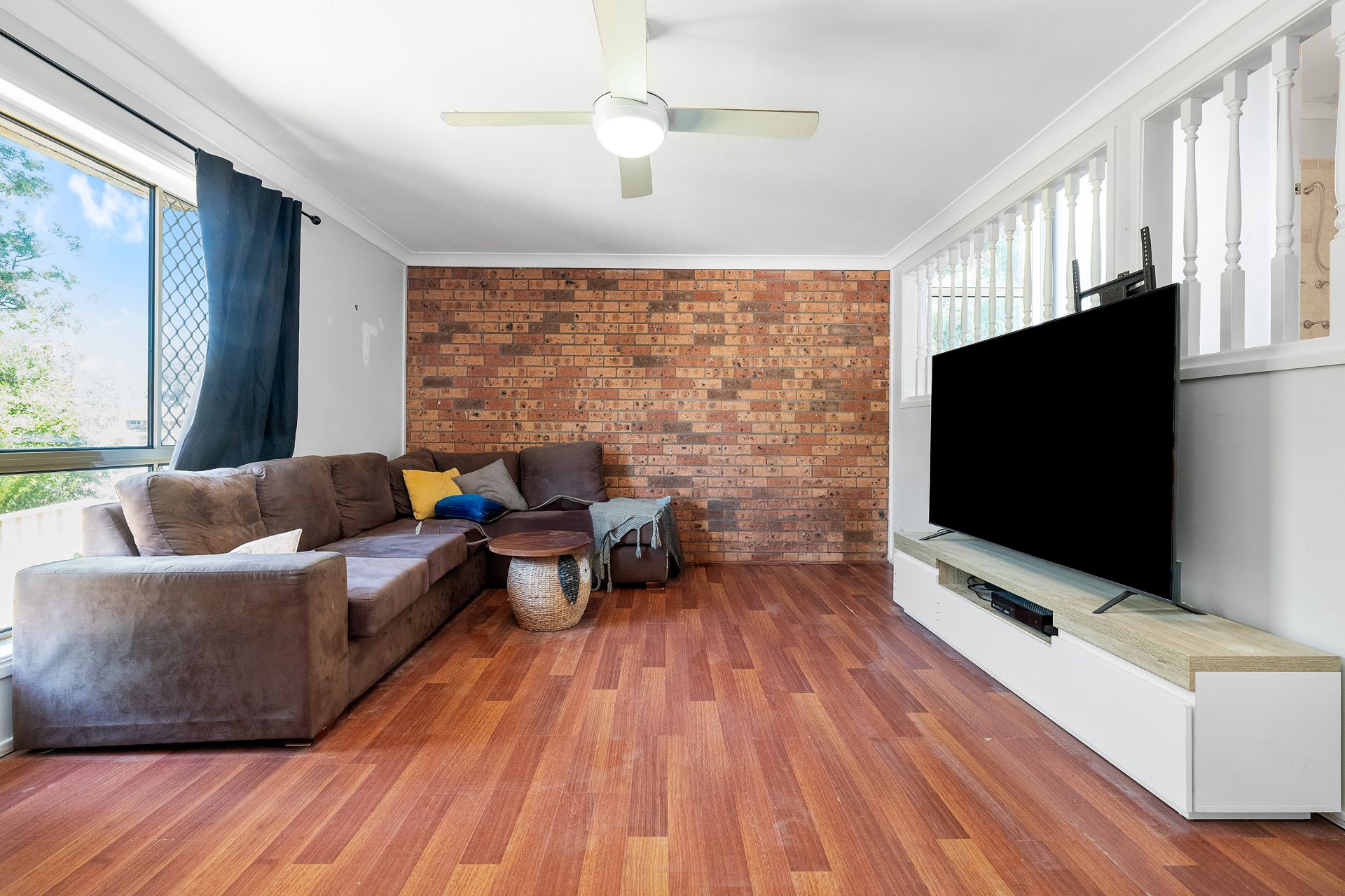 - Generous living area on bottom level with ceiling fan