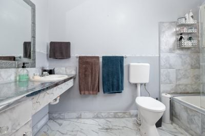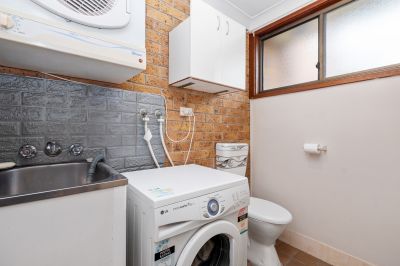 Upstairs, both bedrooms are carpeted with built-in robes, and both also feature air conditioning and a ceiling fan for year-round comfort. The bathroom includes a shower, bathtub, and vanity, and there's a handy extra toilet in the laundry downstairs.