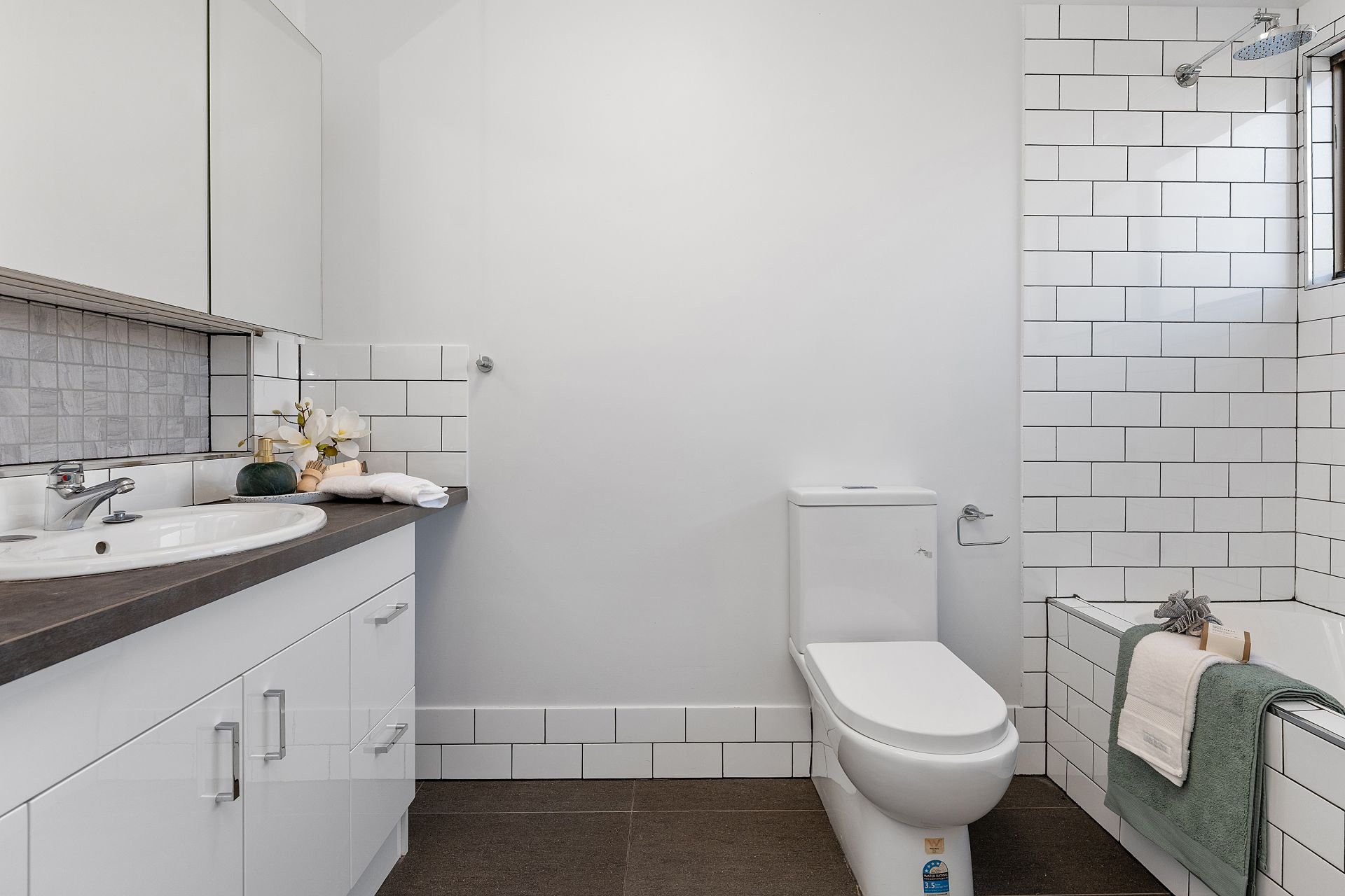 - Modern bathroom with shower over bath & clever built-in cabinetry