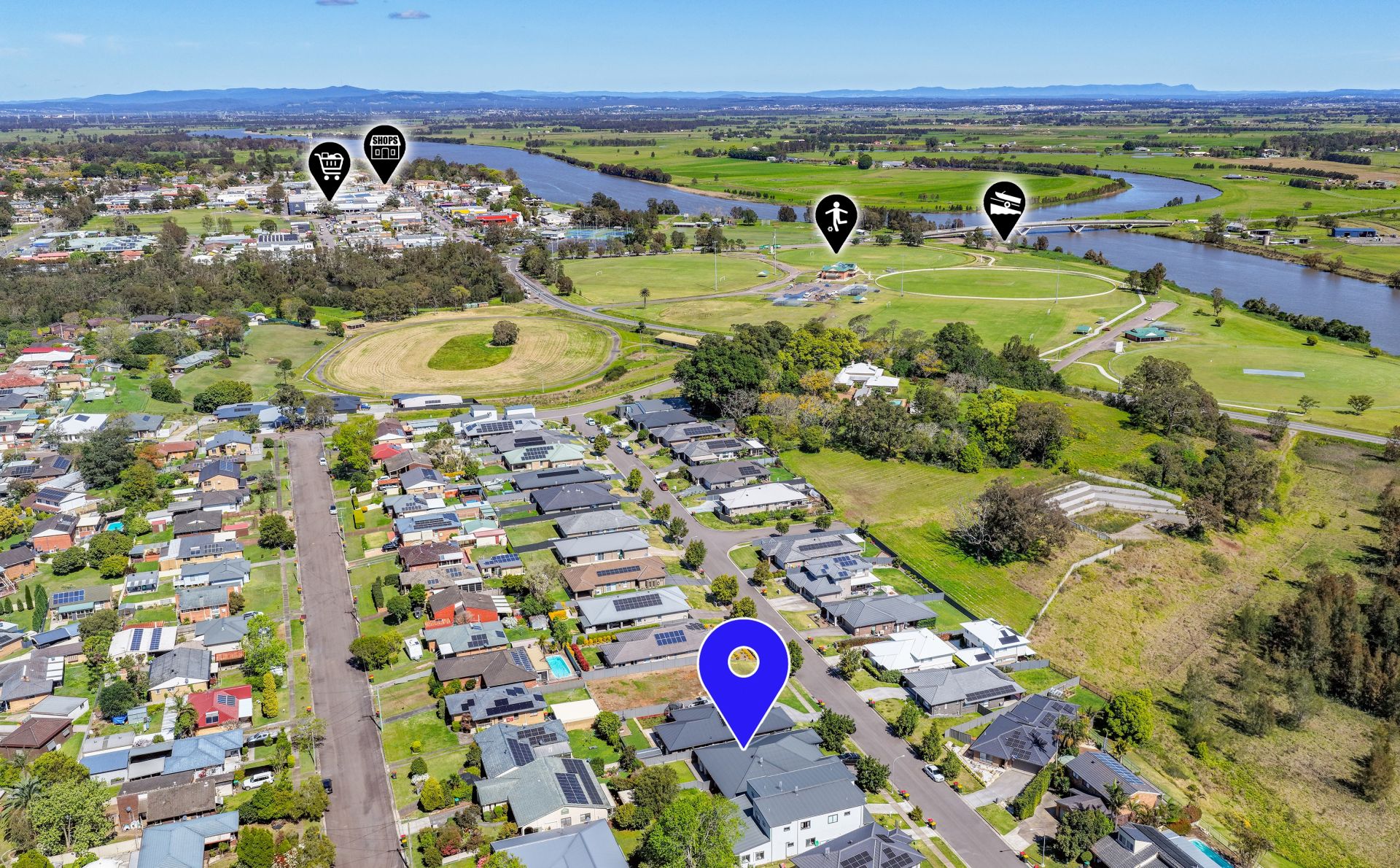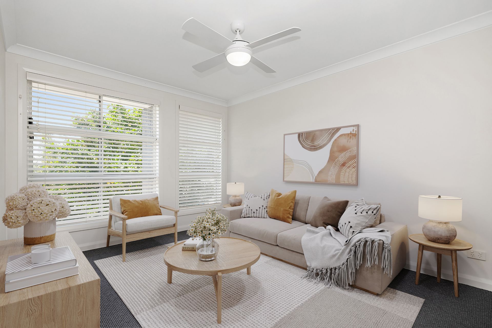 - Front lounge room – carpeted with ceiling fan, enjoying elevated partial views across the valley and river.